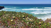 Empezamos subiendo por encima de la playa de Porto Covo, pisando nuestras primeras dunas y avistando los primeros acantilados y las primeras playas a sus pies. Como la marea está baja, en la playa de Sissal descendemos a la orilla del mar para caminar por la misma playa. Algunos senderomagos aprovechan para descalzarse y remojarse los pies. Seguimos por la arena, vigilando la subida de la marea, pese a lo cual hay compañeros que terminan dándose un baño de pies….calzados.